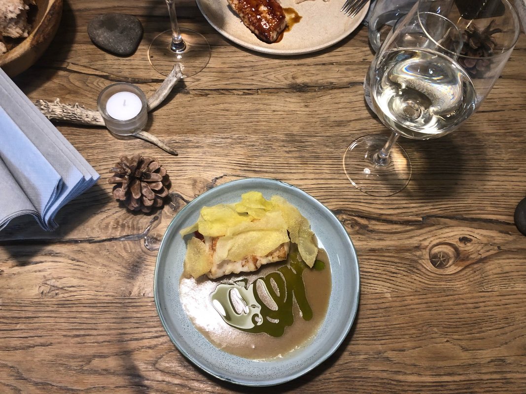 Еда получилась очень вкусной и красиво подана! Мы взяли различные закуски, стружку из кабана и оленя, муксун, из горячих блюд выбрали кролика, утку, плюс десерты и бутылку вина. Обслуживающий персонал был приветливым, рассказывал о каждом блюде, шутил и общался с посетителями, что создавало приятную обстановку. Ресторан имеет уютную обстановку и мы с родителями остались полностью удовлетворены посещением.