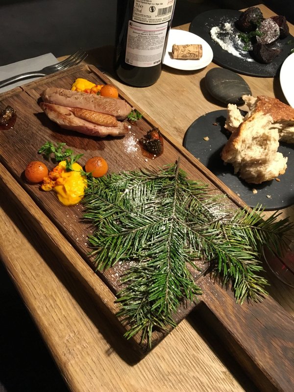 Запомнился шоколадный пирог с брауни, лимонным курдом и кремом, а также козленок с салатом кейл. Обслуживание в ресторане хорошее, без замечаний, атмосфера приятная, вопросов ни к еде, ни к обслуживанию, ни к бронированию не возникло. Интерьер нравится использованием природных материалов: камня, живых елок на столах и можжевельника, который поджигают, создавая важный для атмосферы запах.